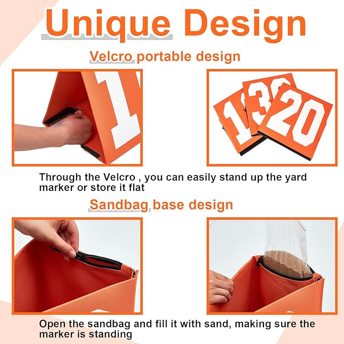 - Self Standing: each yard line marker can be easily supported by hook and -loop fasteners, holds up well against rain and wind, has good results for outdoor use