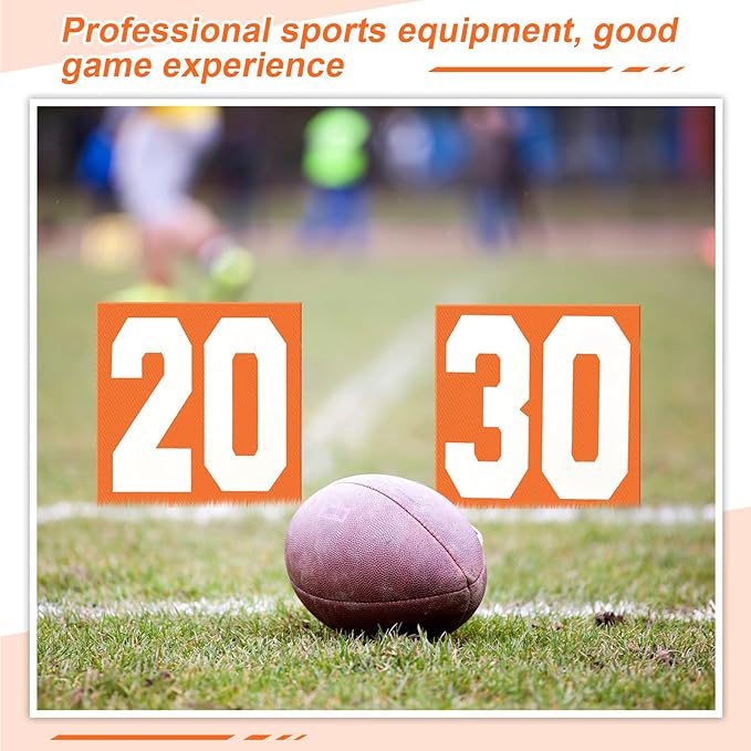 - High Visibility: with 12.5 x 12.5 inches large size, bright orange color and clear weighted printing, these yardage markers are highly visible and easy to read, complete set of 11 double sided soccer sideline markers, suitable for day and night time training, enjoy your training at any time