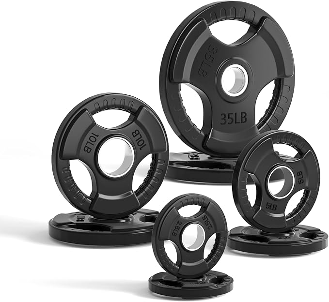 - Comfortable and Convenient: Each plate has 3 openings with strips on them for easy and secure grip when loading and unloading the weights. Labeled in LB for easy recognition.