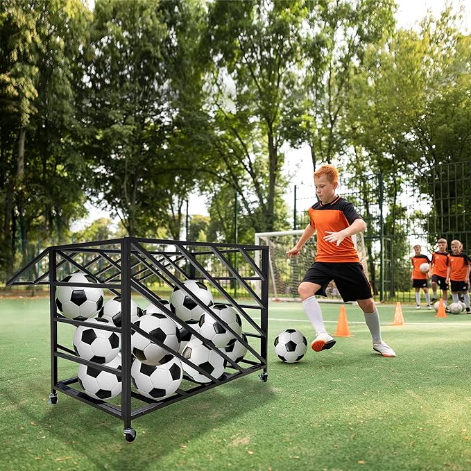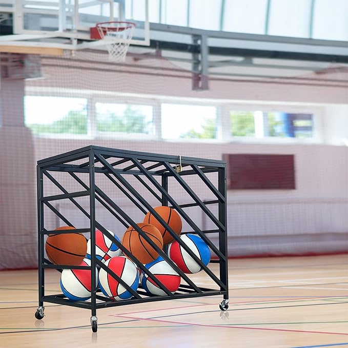 - DURABLE CONSTRUCTION: The ball storage cart is crafted from heavy-duty, powder-coated metal iron for long-lasting performance. The UV- and rust-resistant coating makes it suitable for both indoor and outdoor use so you can store this portable ball locker at the gym, garage, school, or sports club.