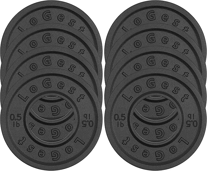 - 8-Piece Set: Overcome lifting plateaus and reach a new personal best with LoGest’s Set of 8 Plates. Each one is 4.4 inches long with a weight of 0.5 pounds, taking up minimal space on a bar sleeve to leave plenty of room for other plates and collars.
