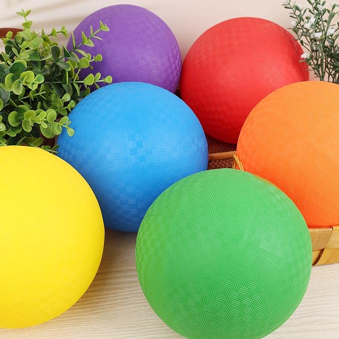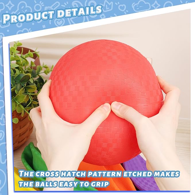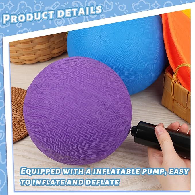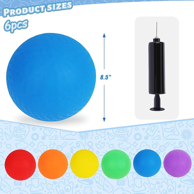 - Package Include: The ball set includes 6PCS playground ball in different colors and 1PC air pump (Placed inside of the handle of pump ). The ball has an 8.5 inch diameter (after fully inflating), featuring textured no-slip grip, bright and vibrant.