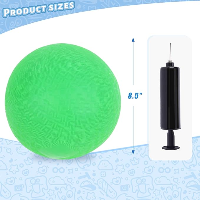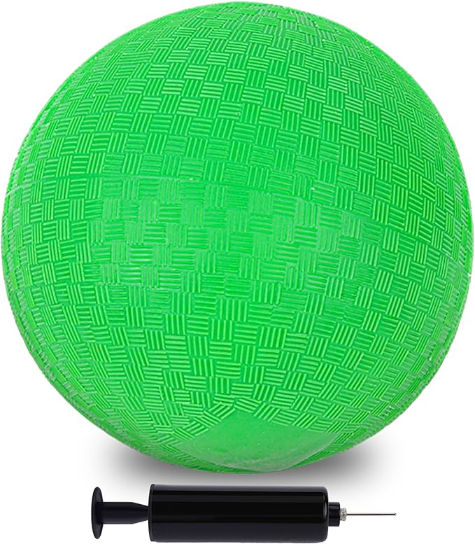- Package Include: The ball set includes 1PC green playground ball and 1PC air pump (Placed inside of the handle of pump ). The ball has an 8.5 inch diameter (after fully inflating), featuring textured no-slip grip, bright and vibrant.