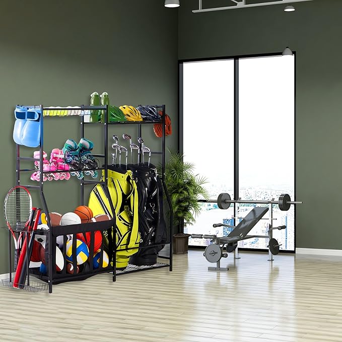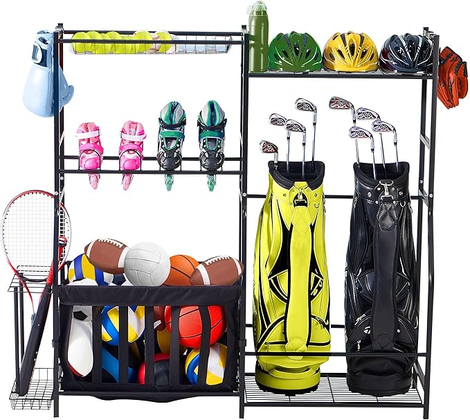 - LARGE CAPACITY STORAGE - With 3 shelves and 2 baskets, the organizer is big enough to hold golf bags, basketballs, skateboards, yoga mats, and more. The included hooks and bat rack help to keep small items nice and tidy