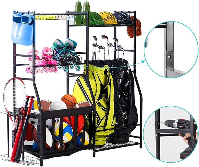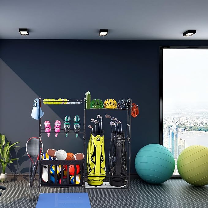 - STURDY AND DURABLE - Made of high-quality steel with a powder-coated finish; with its sturdy construction and premium materials, the sports equipment organizer can be used for years