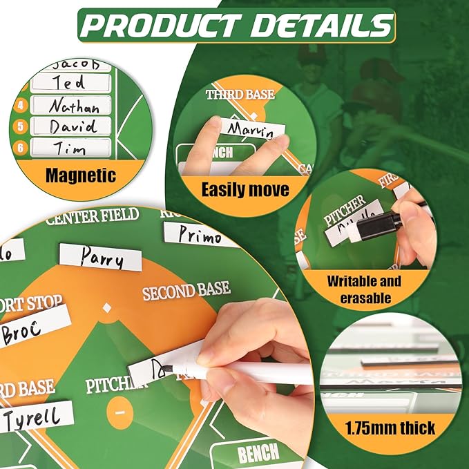 - PACKAGE LIST: You can get 30 sets of individually packaged coaching boards. Each set of magnetic baseball coaching accessories includes 1 tactical coaching board, 40 magnetic lineup cards, 1 black dry wiping pen and 1 red dry wiping pen, and 2 pieces of hooks,Our baseball lineup board measures 12.6 x 11 inches, the magnetic name strip is 1.97 x 0.43 inches.