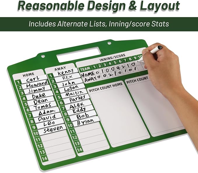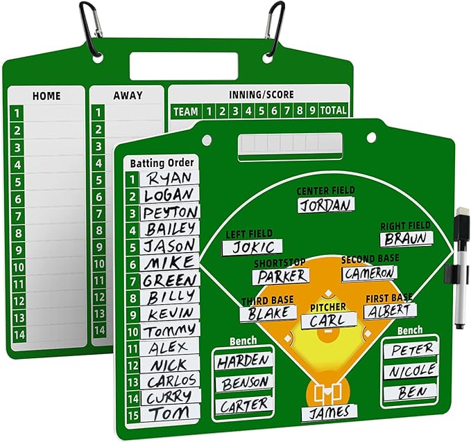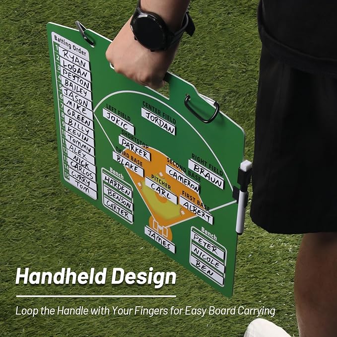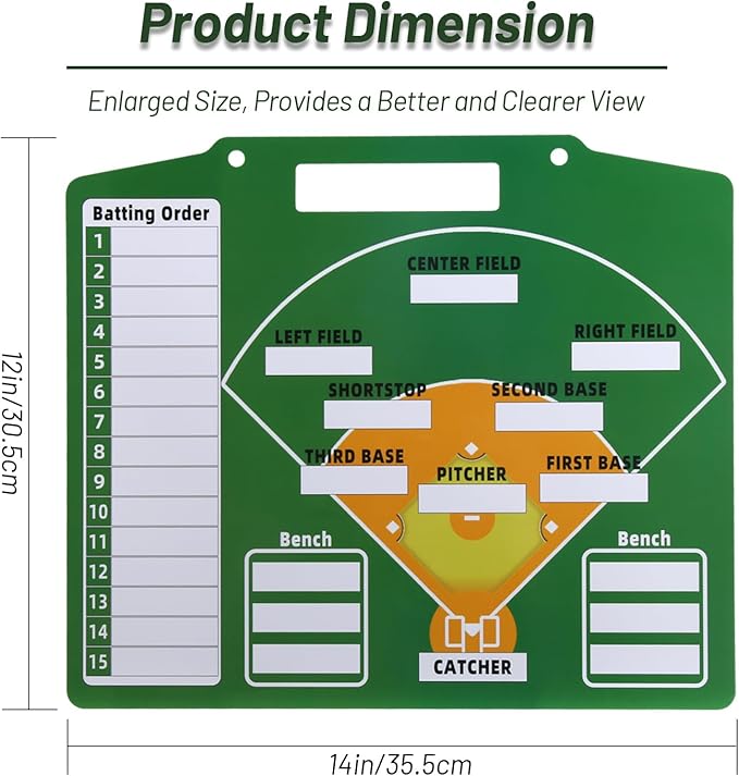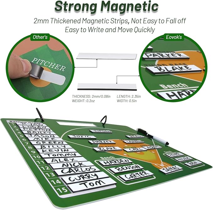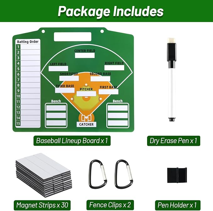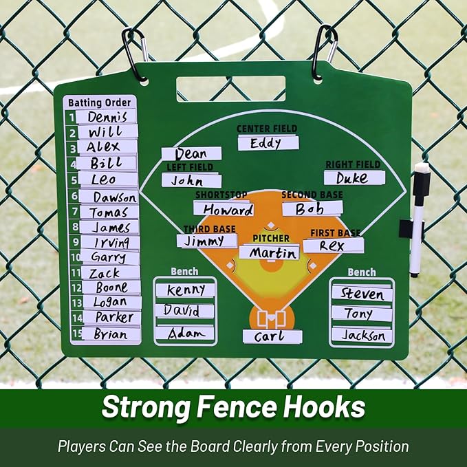 - Easy Carry with Strong Magnet tabs, Hooks and Dry Erase Pen with Holder: Our baseball coaching accessories has dry erase pen with holder, strong magnet tabs and hooks, which is easy to carry to the baseball field or outfield to hang on the fence and strong magnet tabs doesn't come off easily on a baseball lineup board.