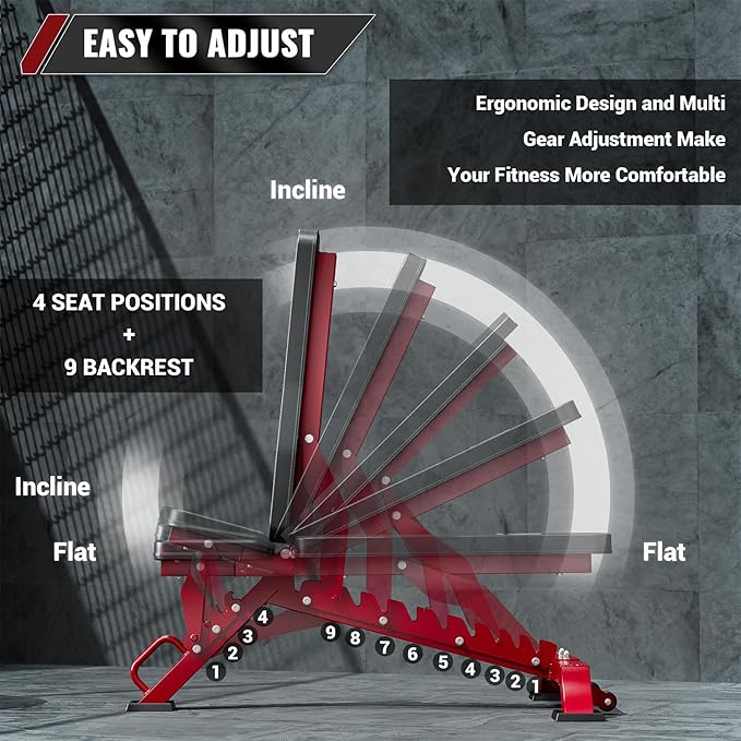 - Quick and Safe Adjustments: Enjoy hassle-free adjustments with our C-shaped lock catch, which eliminates the need for cumbersome pin-pulling. The exercise bench offers 9 backrest positions and 4 seat positions, allowing for incline, flat, and decline configurations. You can even achieve a 90-degree angle, making it an ideal incline bench for a comprehensive range of exercises targeting your abs, arms, shoulders, back, and chest