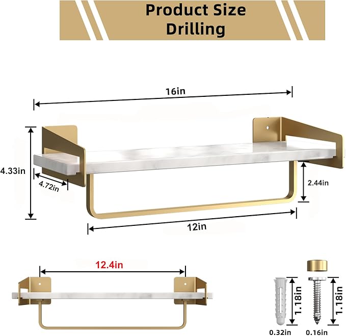 - Perfect Size:The size of marble bathroom wall shelf L x W x H is 16 x 4.72 x 4.33 inches,the towel bar length is 12 inches.A small shelf completes a large storage in the bathroom