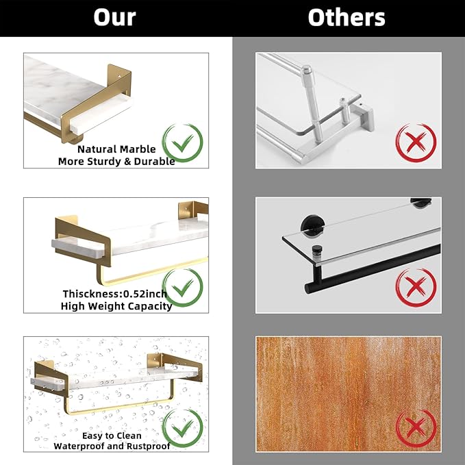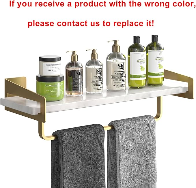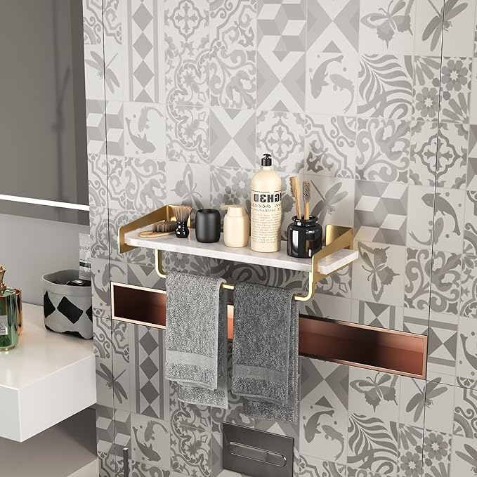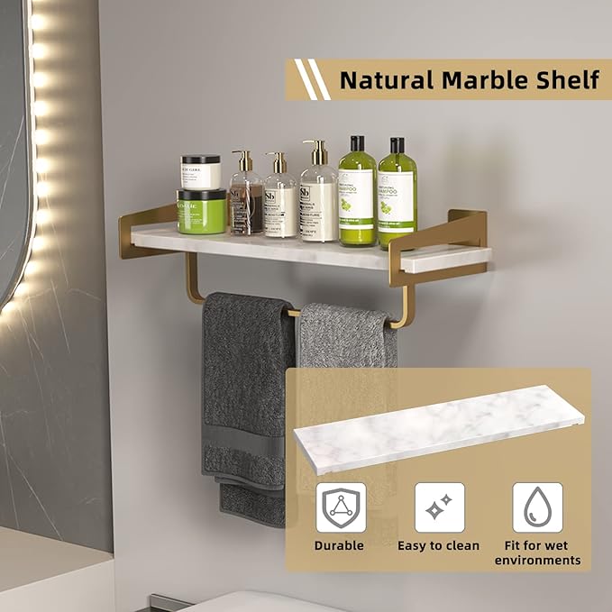 - Modern Design:The bathroom wall shelf and the towel bar are all-in-one and Bottom of marble slab card slot non-slip design.The white marble surface has a unique texture,paired with metal shelf,suitable for various decoration style