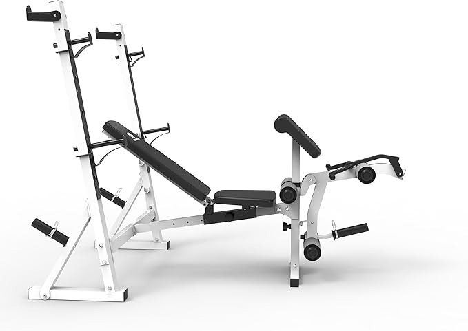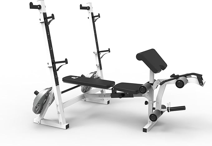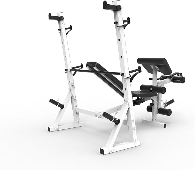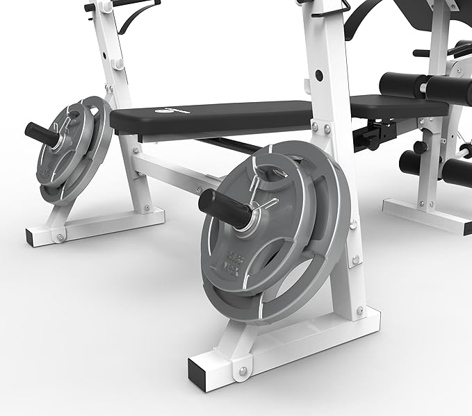 - Comprehensive Sit-Up Bench Training: Features a bench press rack storage post for weight plates (weights set for home gym not included), squat bar catch, barbell bar catch, and safety bar catch
