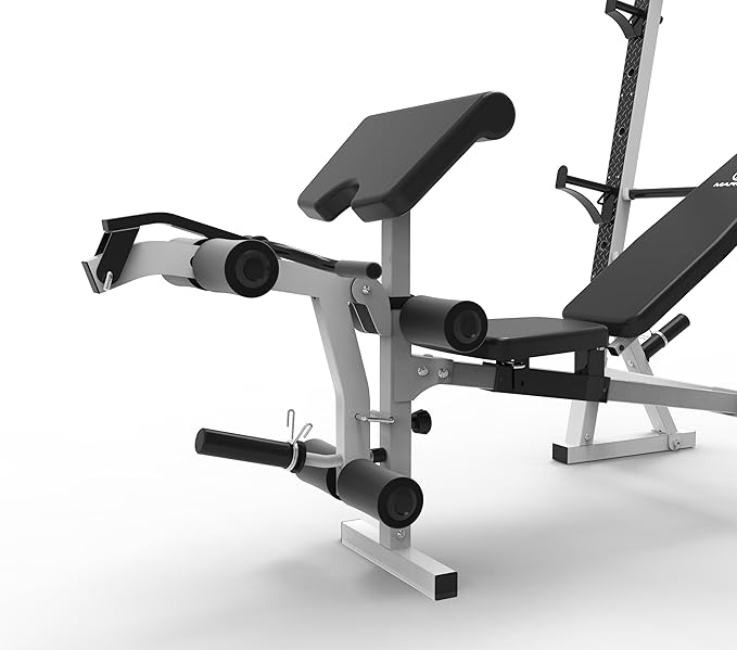 - Efficient Muscle Isolation: Includes a preacher curl pad and handle for a great arm workout, as well as a leg extension for pivotal leg day workouts; Max weight on leg developer: 100 pounds