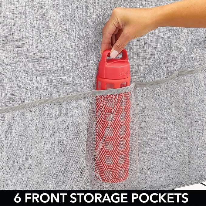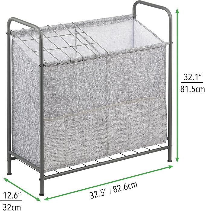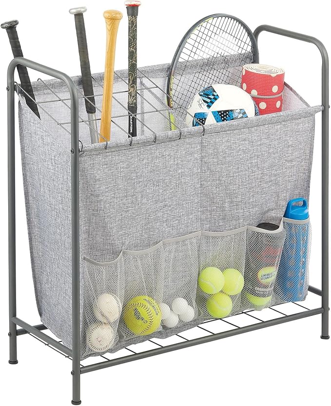 - SIMPLE STORAGE: Keep mudrooms, entryways, and garages neat and tidy with this sports equipment storage rack; This durable organizer has two large baskets, six front pockets, adjustable feet, and an optional wire grid to store equipment like bats and sticks upright; A perfect holder for workout gear; A great container for busy families with kids and teens; The modern styling of this organization rack for toys and sports accessories will add some style to your storage and compliment your decor