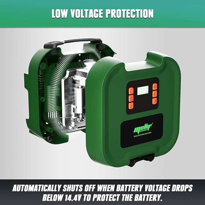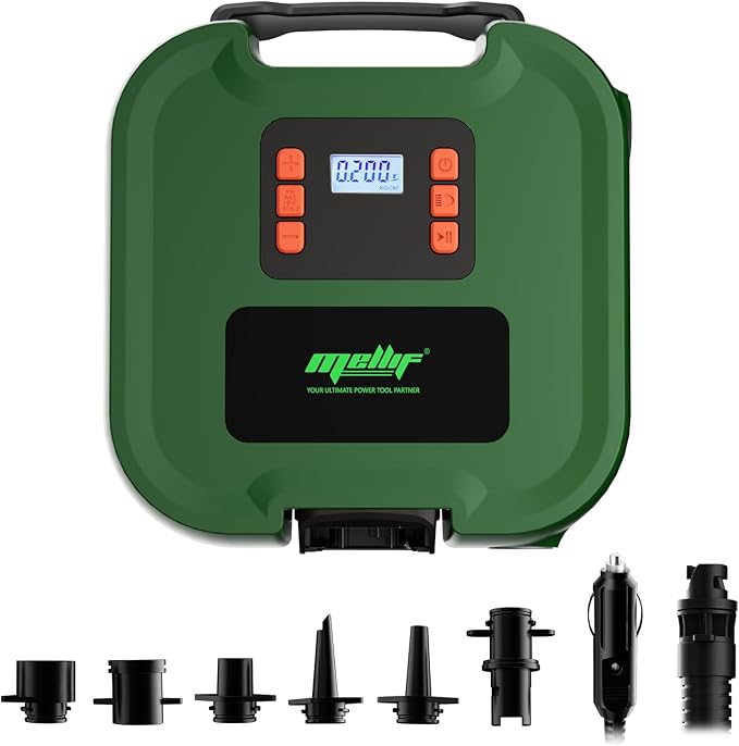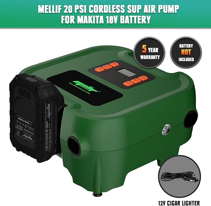 - Compatibility: Mellif paddle board pump is compatible with Makita 18V batteries (Battery Not Included), featuring low voltage protection that automatically shuts off when voltage drops below 14.4V to prevent over-discharge and protect battery life.