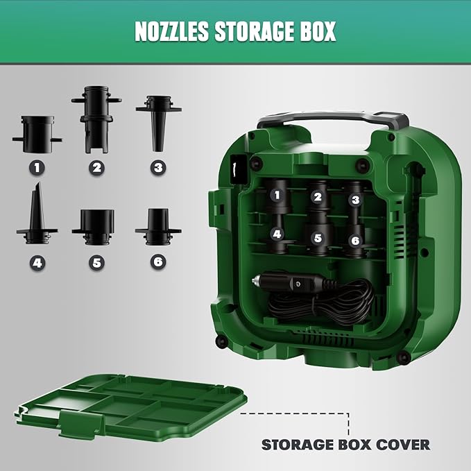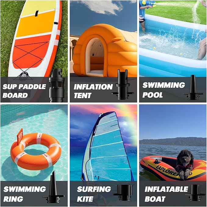 - Wide Application: Our high pressure air compressor comes with 6 different nozzles, making it suitable for most high-pressure inflatable devices such as stand-up paddle boards, air mattresses, kayaks, boats, arches, pools, tents, and more.