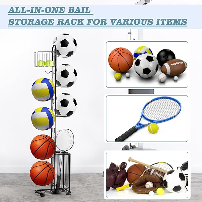 - 【 MULTIFUNCTIONAL Storage Basketball Ball Rack】: Equipped with two baskets, the racket basket can hold some small balls for tennis, badminton or rugby and items such as knee pads, and the lower level can hold baseball bats, as well as softball rackets, tennis rackets, badminton rackets, pickleball rackets and other sports equipment.