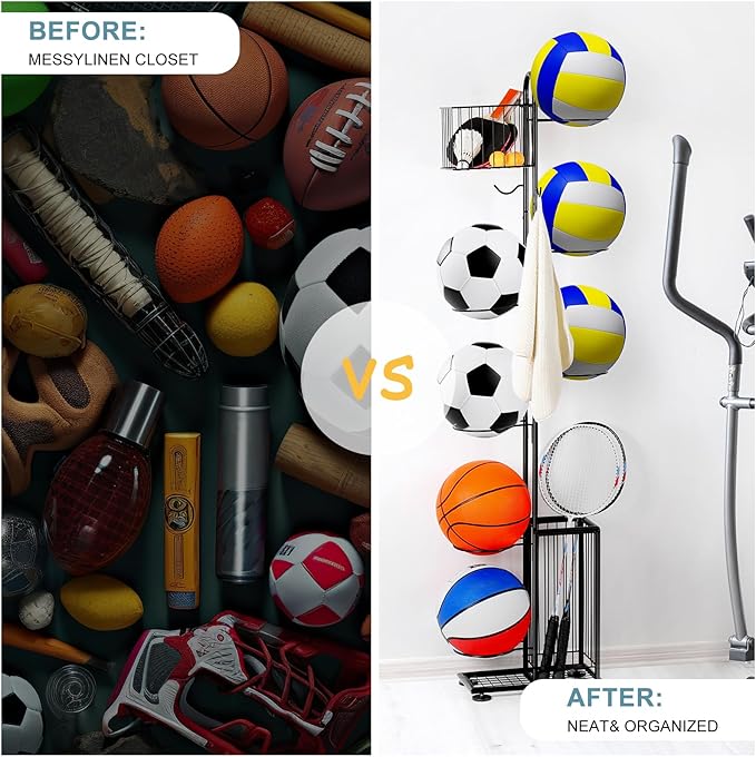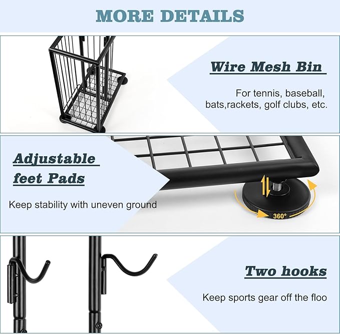 - 【MULTIFUNCTIONAL HOOKS】: The Storage Ball Rack is equipped with multifunctional hooks for hanging sports bags, gloves, hats, jerseys and all other sporting goods, simple structure and easy to use.