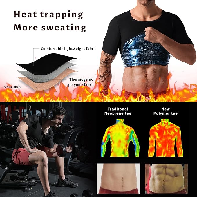 - HOT TEAT MATERIAL:QZSH new sauna sweat tee uses a heat-absorbing polymer fabric to stimulate your natural body heat and increase sweating during any physical activity. In your sport,fitness or daily life,wear our sweat tee and feel the sauna-like experience, and you can even reach the gym with three times the sweating effect. Your body temperature rises, you sweat more, and you gain less weight. Let you experience weight loss anytime, anywhere
