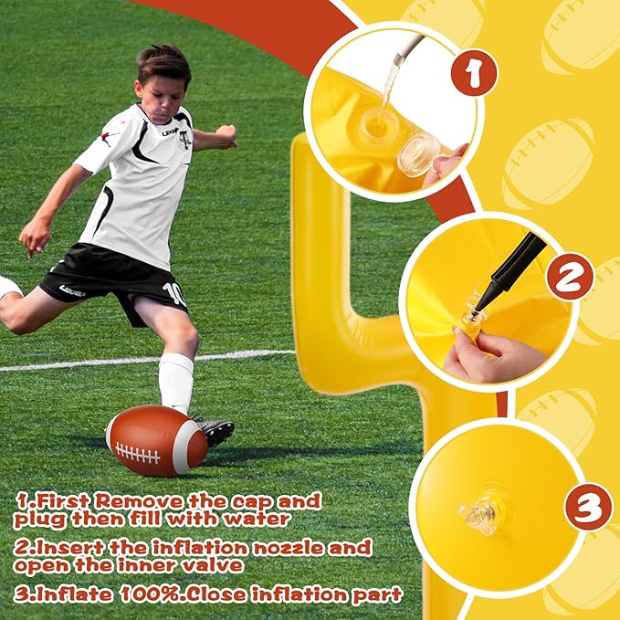 - How to Use: first, remove the lid of the inflatable football goal posts and then fill them with water; Second, insert the inflation nozzle and open the inner value; Third, inflate 100%, finally, close inflation part