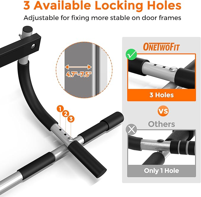 - VERSATILE FIT - ONETWOFIT exercise bar adjusts to fit door frames spanning 24 to 36 inches wide. Skip the hassle of wall drilling and simply hang it on your door frame. With 3 holes for varying depths (4.7”-7.5”), it ensures a secure fit every time.