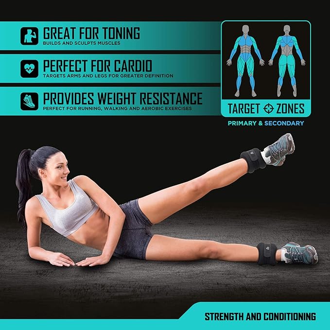 - Adjustable Ankle Weights : The RBX ankle weights for men and women help target, strengthen, and tone specific muscle groups in your legs and arms, and can be used to add more of a challenge to your cardio workouts!