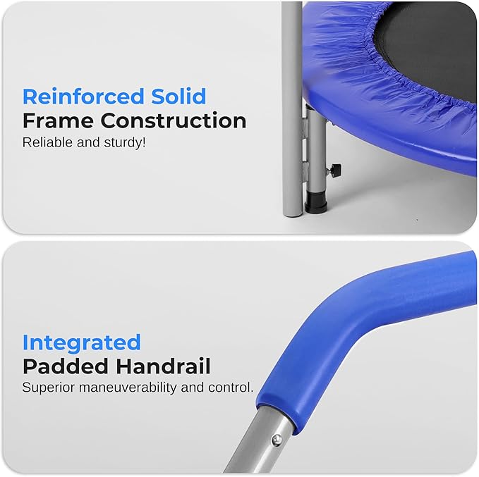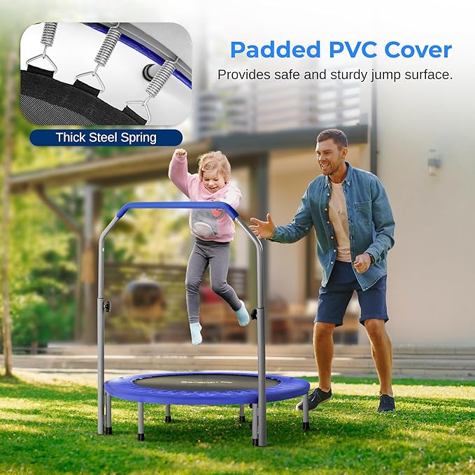 - ADJUSTABLE HANDLEBAR: The mini trampoline for adults features a foam-padded handle adjustable to 5 height levels (35.8"–48"), providing a comfortable grip and added stability for users of different ages and fitness levels.