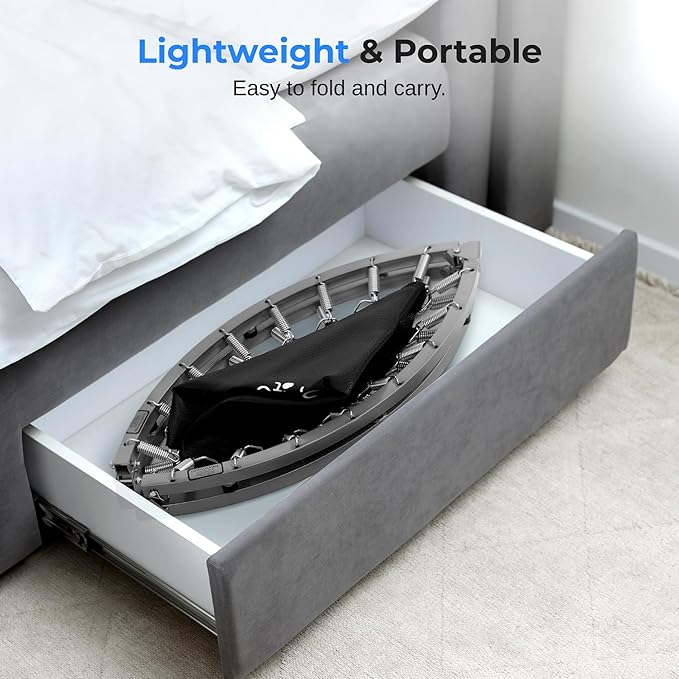 - COMPACT & PORTABLE: Designed with a unique foldable frame, this indoor trampoline easily fits into small spaces such as under beds, in closets, or car trunks, making it perfect for home use or travel. Free carry bag included.