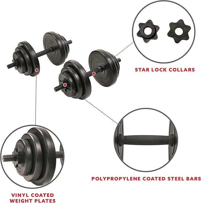 - 40 POUNDS: Each set comes equipped with a pair of dumbbells with enough weight to create 2 dumbbells weighing 5 pounds, 10 pounds, or 20 pounds.
