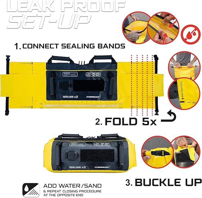 - Sandbag Capacity of 120 LBS containing sand or 77 LBS containing water.