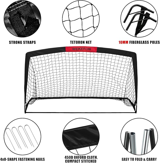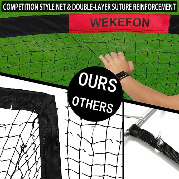 - 【Heavy Duty Polyester Nets】 Our soccer net are made from three strands of polyester net with appropriate mesh size for added durability, and the portable soccer goals equipped with 450D oxford fabric for pole sleeves and double seams reinforced to ensure defence tearing. The perfect solution for the collapsible soccer goals can withstand large amounts of strong shoots, lasts kick after kick.