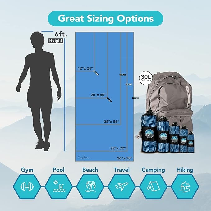 - PACK FOR ANY SITUATION: Youphoria all-purpose travel towels come in three convenient sizes, in inches: 20 x 40, 28 x 56, and 32 x 72. Whether you need pack light camping towel, shower gym towel, a small pack towel, or a large beach towel, we've got your covered. Youphoria microfiber towels are a more convenient and packable option for your on-the-go needs.